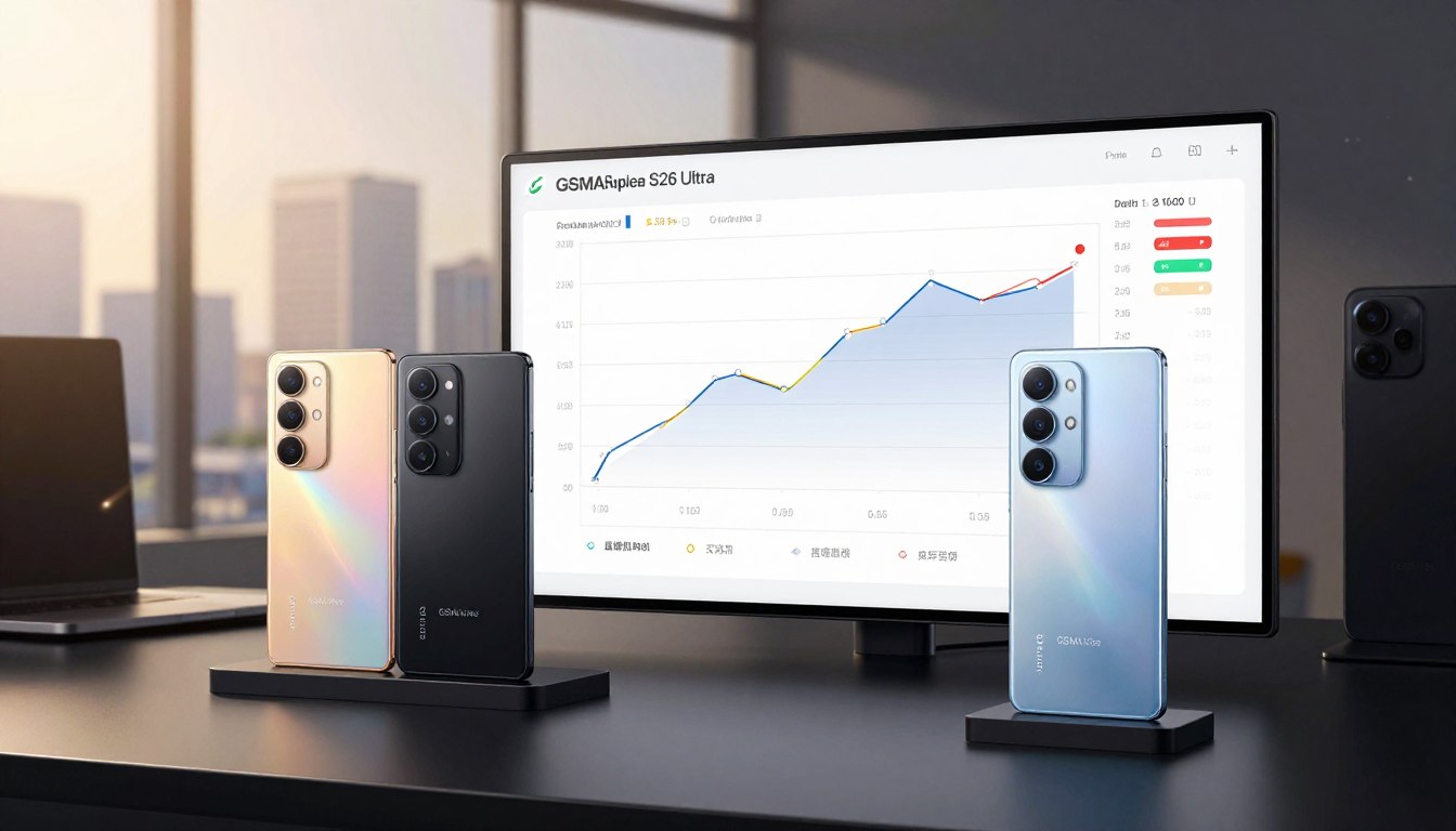 A high-tech smartphone comparison scene showcasing the GSMArena S26 Ultra and previous flagship models. In the foreground, two flagship smartphones are elegantly displayed on a sleek black surface, highlighting their unique designs and specifications. The middle ground features a magnified view of a benchmark performance chart, showcasing graphical comparisons of processing power and camera capabilities. In the background, a subtle blend of modern tech gadgets and a soft-focus cityscape through a large window creates an innovative atmosphere. Use warm, dynamic lighting to enhance the devices' features, emphasizing their advanced technology, with a slight lens flare effect to give an alluring edge. Aim for a clean, futuristic vibe, suggesting innovation and performance excellence.